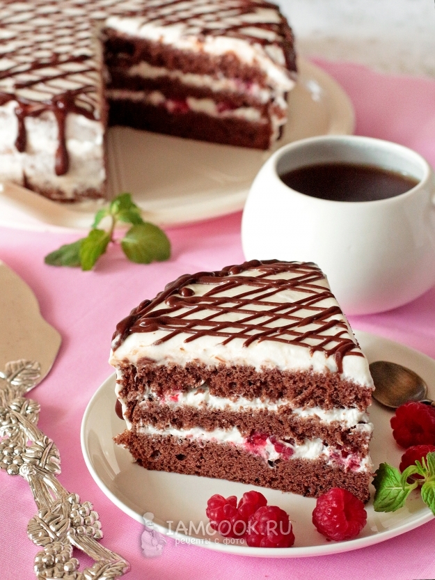Сочетание шоколадного бисквита и малины понравится, думаю, всем. В приготовлении торт несложный, только не нужно ничего от себя добавлять, кроме количества сахара - его можно регулировать по своим предпочтениям. Я кладу в бисквит 120 граммов, а в крем добавляю мало, и поэтому торт у меня совсем не приторно сладкий - такой, как мы любим.