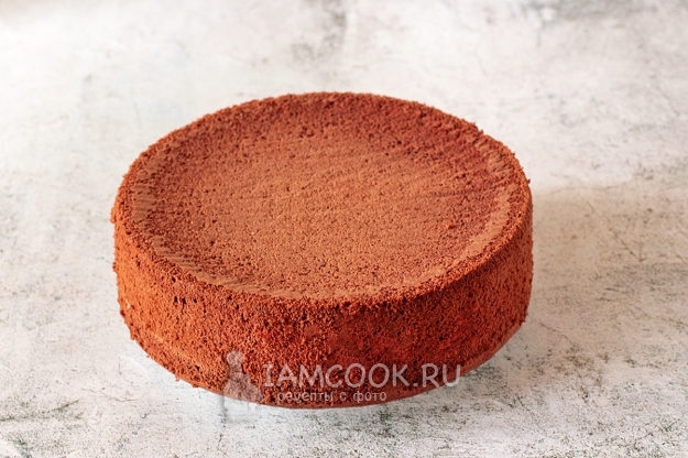 Достаньте форму из духовки и сразу же переверните ее вместе с бисквитом вверх тормашками, например, зацепив ее за края стаканов, чтобы под бисквитом проходил воздух. Бисквит не выпадет, а будет держаться в форме, мы же не смазывали ее бока. В таком виде можно оставить форму на всю ночь или на несколько часов. Затем остывший бисквит извлеките из формы и разрежьте на три коржа.