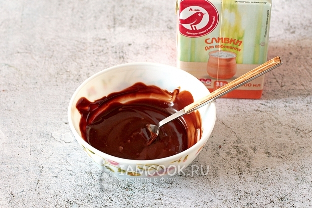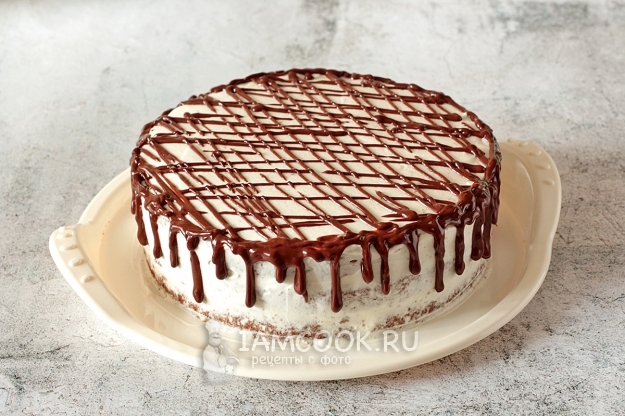 Для шоколадного ганаша возьмите шоколад и оставшиеся сливки. Растопите шоколад в микроволновке - по 30 секунд два раза, каждый раз его перемешивая. Влейте в горячий шоколад сливки и хорошо размешайте до гладкости. Дальше регулируйте густоту ганаша, если необходимо, добавляя по ложке сливок: добавили - размешали, проверили, как льется. Точного рецепта не может быть просто потому, что шоколад разный и сливки тоже разные по густоте. Мне надо было, чтобы из тоненького отверстия кулинарного пакета ганаш лился тонкими нитями, а при разрезании торта эти нити были мягкими. Можно не заморачиваться, а просто использовать растопленный шоколад без сливок, получится тоже красиво, но в этом случае при разрезании торта шоколадные нити будут ломаться.