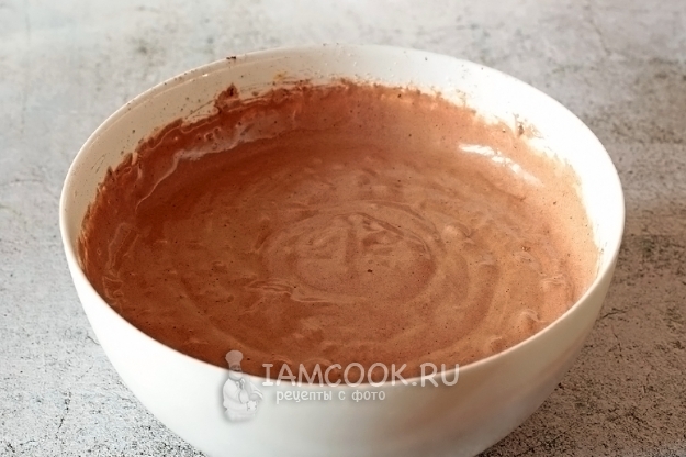 Соедините муку и какао, перемешайте. Я хоть и перемешивала муку с какао, кусочки какао остались, только после просеивания они разошлись. Добавьте просеянную муку с какао и ванилином в яичную смесь в два этапа. Размешайте ручным венчиком, тщательно проходя по дну миски.
