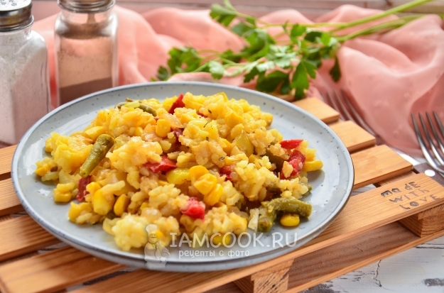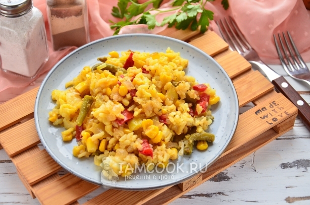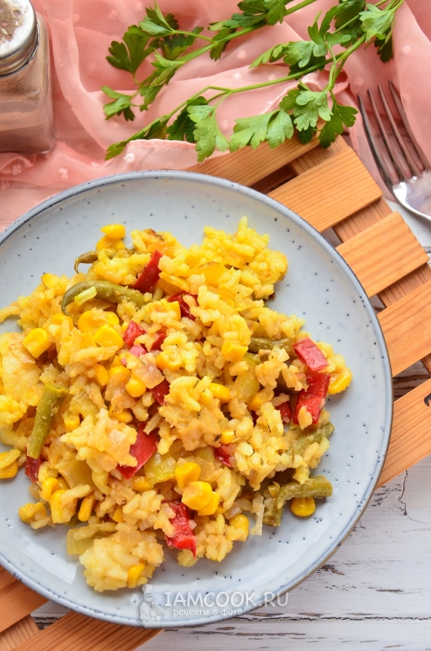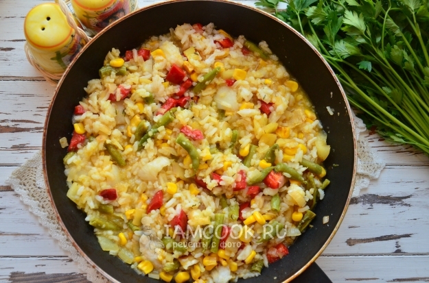 Овощная паэлья подойдет для постной или вегетарианской диеты, овощная составляющая может меняться от случая к случаю. К примеру, можно использовать лук, перец, помидоры, стручковую фасоль, кабачки, горошек и кукурузу, а также грибы. Так как паэлья - это настоящий испанский плов, рис нужно брать среднезерный или длиннозерный, но никак не круглый. Также в состав паэльи обязательно должен входить шафран.