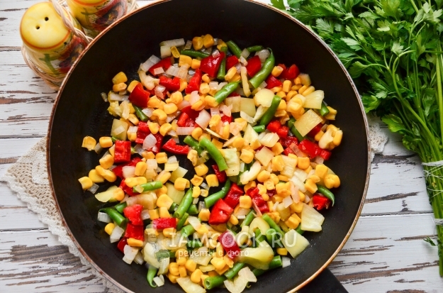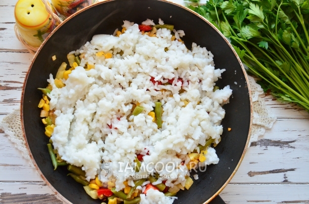 Обжаривайте овощи минут 5, после чего переложите в сковороду сваренный почти до полной готовности рис.