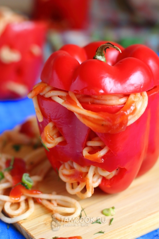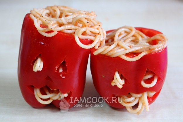 Перцы, фаршированные спагетти, на Хэллоуин готовы! Скорее подаём к столу, делаем пару фотографий и приступаем к трапезе, а то макароны быстро остынут! Приятного аппетита!