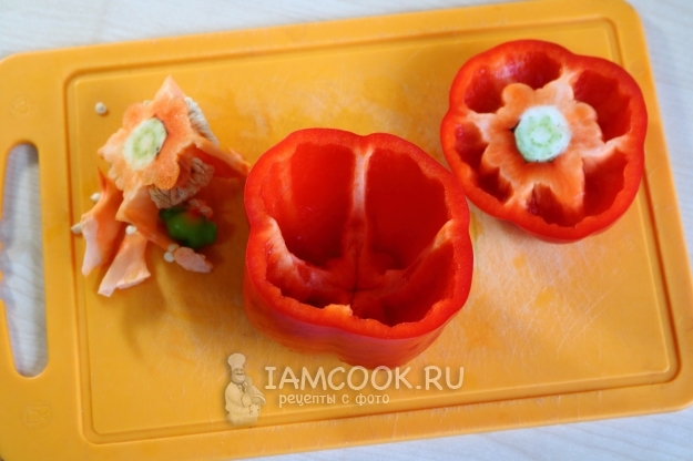 Болгарские перцы промываем, просушиваем. Острым ножом срезаем у овоща его верхушку с хвостиком. Удаляем внутренности: семечки, прожилки и прочее.