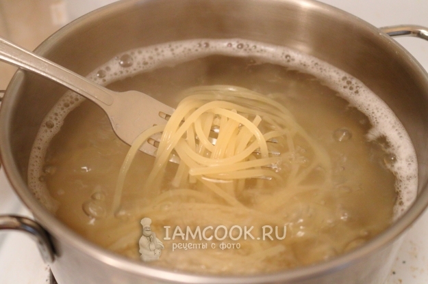 Перцы готовы, переходим к начинке. Спагетти закидываем в кипящую подсоленную воду и отвариваем до готовности согласно инструкции на упаковке. Это займет примерно 8-10 минут.