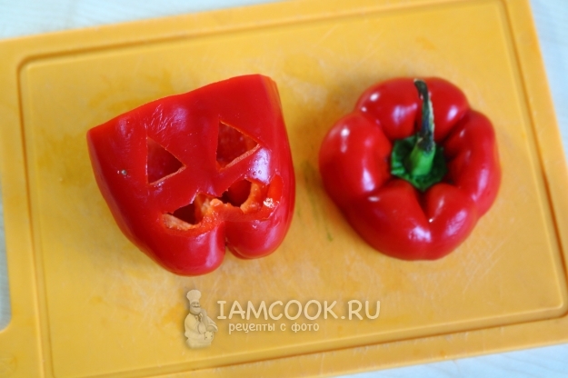 У «туловища» перца, или точнее сказать его «головы», вырезаем также острым ножом глаза-треугольники и страшный корявый рот. Стараемся делать отверстия больше.