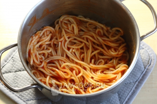 Перемешиваем аккуратно, чтобы спагетти остались целыми.