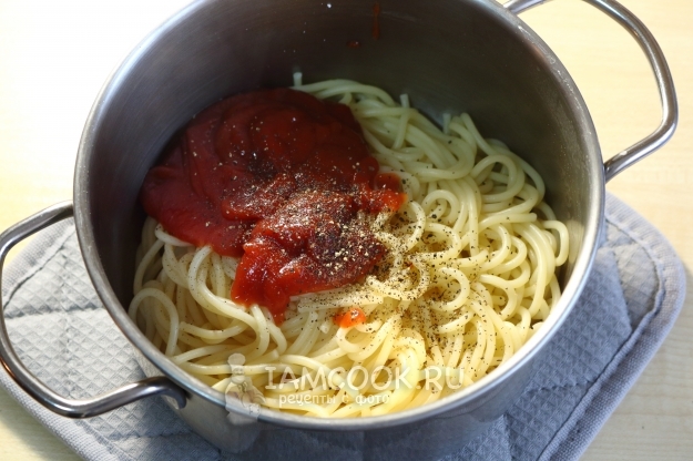 Возвращаем в кастрюлю и обильно заправляем кетчупом. Можно добавить на этом этапе кусочек сливочного масла. Также всыпаем черный перец по вкусу. Можно и красного добавить для неожиданности.