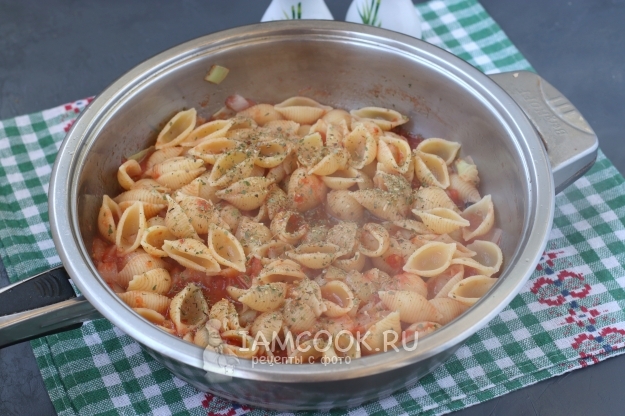 Высыпать готовую пасту в томатный соус, немного поперчить и добавить смесь трав, растирая их между пальцами для усиления аромата. Готовить ещё 2 минуты.