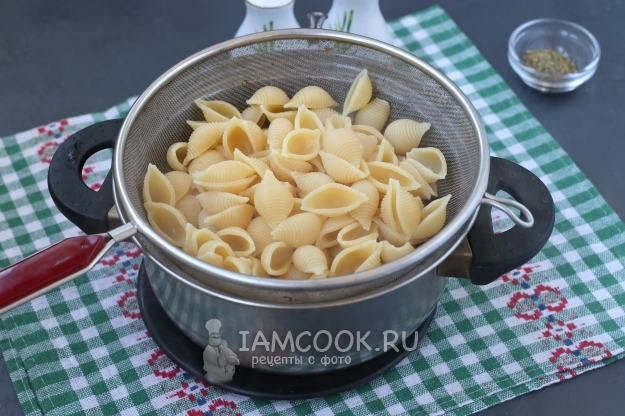 Пасту после варки откинуть на сито, чтоб ушла вся лишняя вода.