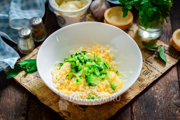 Огурец нарезать мелкими кубиками и добавить в миску с яйцом.