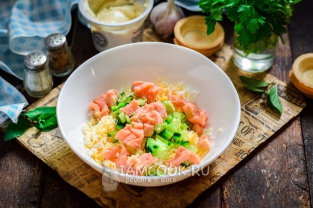 Копченую горбушу отделить от косточек, после нарезать её мелкими кубиками и добавить в миску с яйцом и огурцом.