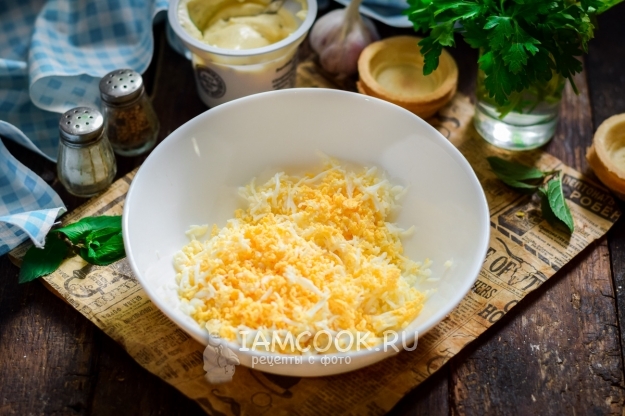 Почистить яйцо от скорлупы, натереть его на мелкой терке, уложить в глубокую миску.