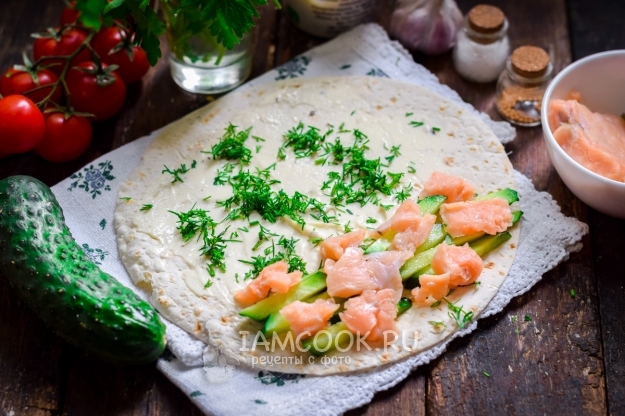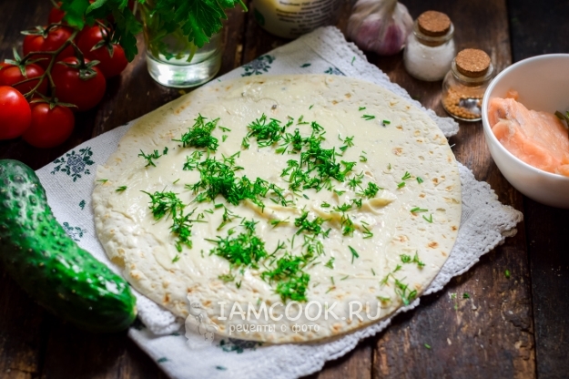 Свежий укроп сполоснуть и просушить, мелко нарезать и разложить по всему лавашу.