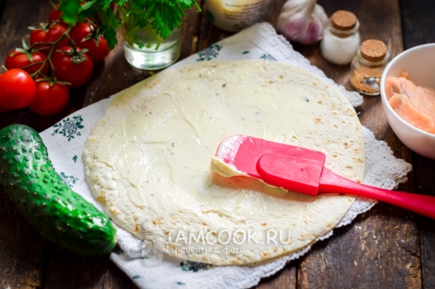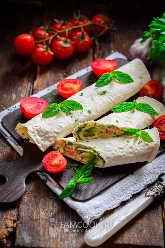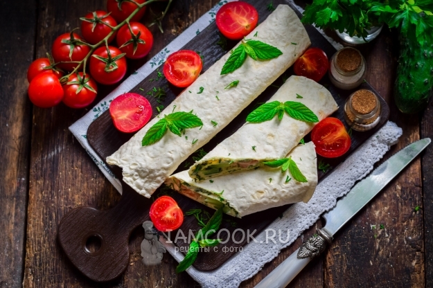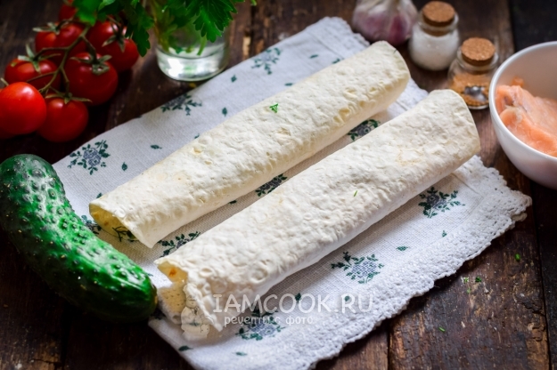 Аналогичным образом поступить со всеми заготовками лаваша, после свернуть их рулетами.