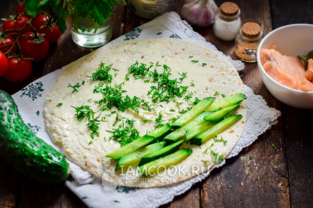 Огурец вымыть и просушить, нарезать полосками, выложить на край лаваша.