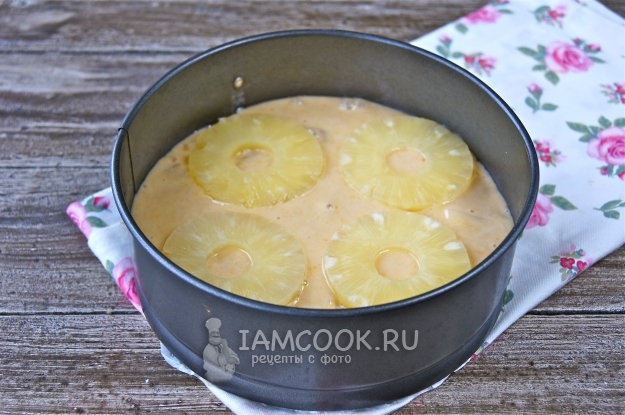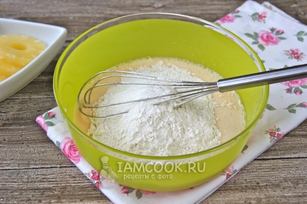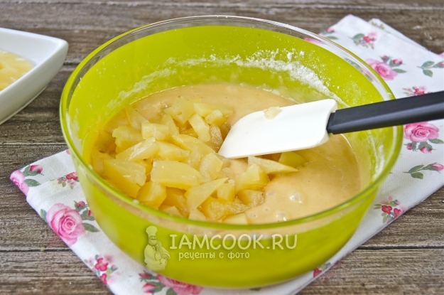 Добавьте кусочки ананаса, перемешайте лопаткой.
