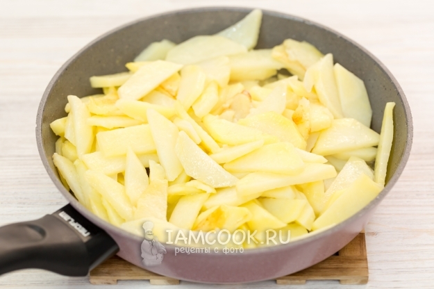 Я кладу на сковороду сразу много картошки - мне нравится, когда снизу она поджаривается, а верхняя, пропитываясь жаром снизу, становится мягкой и нежной, как паровая.