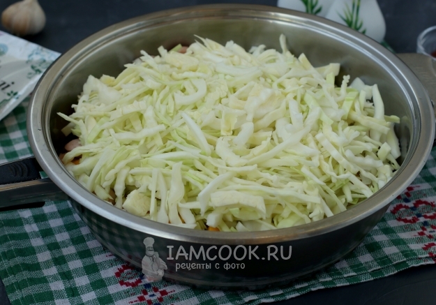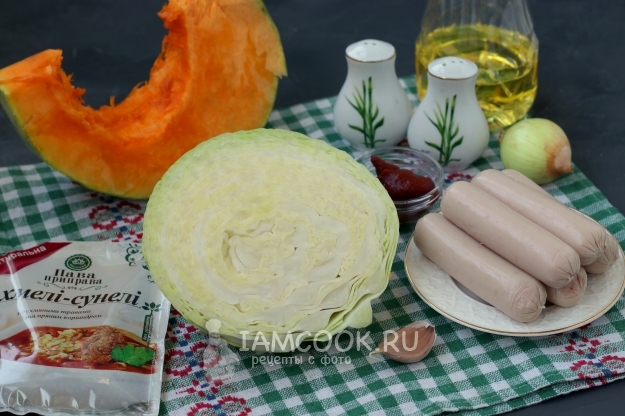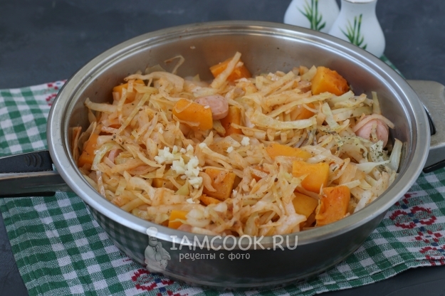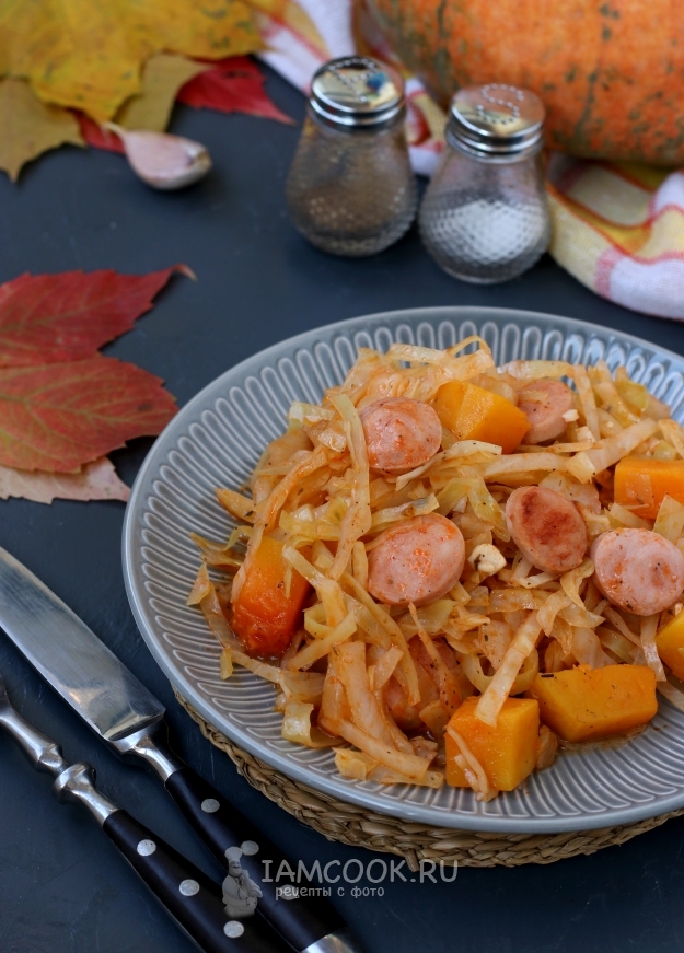 За это время нашинковать капусту. Тыкву перемешать с сосисками и добавить в сковороду капусту.