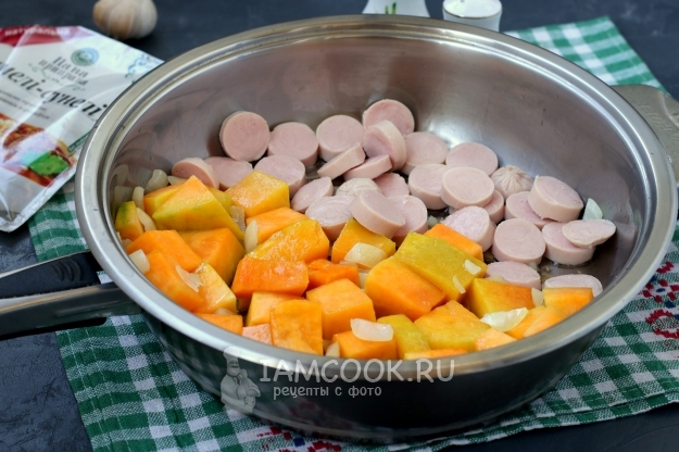 Кубиками нарезать лук, измельчить часть чеснока, сосиски нарезать шайбочками. Тыкву нарезать крупными кусочками 2-2.5 см.