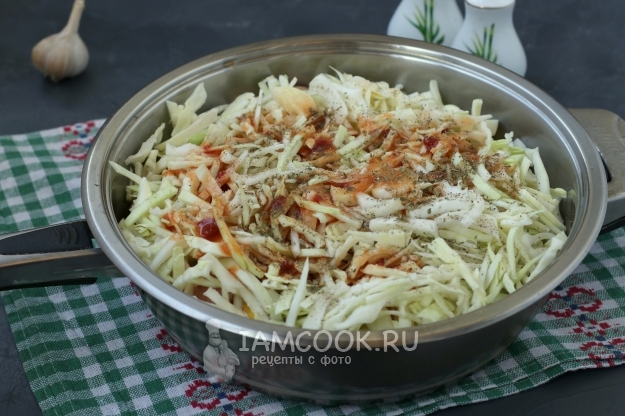В воду добавить томатную пасту, размешать и вылить на капусту, посолить и поперчить, добавить хмели-сунели. Сковороду накрыть крышкой и готовить капусту 15 минут на небольшом огне.