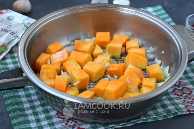 В сковороде разогреть подсолнечное масло, добавить лук с чесноком и слегка припустить - до появления аромата. Добавить в сковороду тыкву и готовить 5-7 минут на среднем огне.