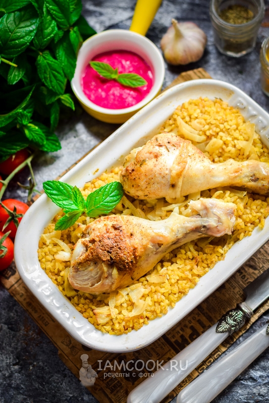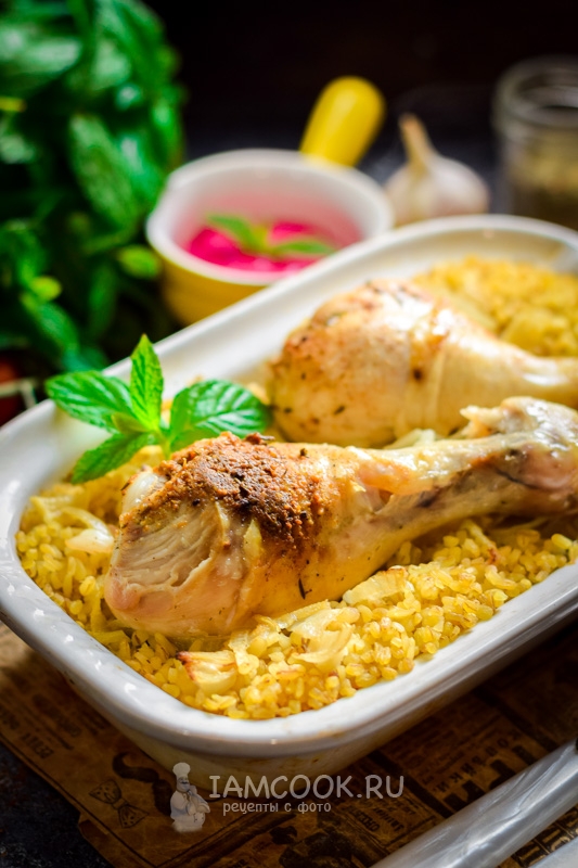 Запечатать форму фольгой, запекать булгур с куриными ножками в духовке в течение 25 минут. Спустя время готовую кашу и курицу подавать к столу.