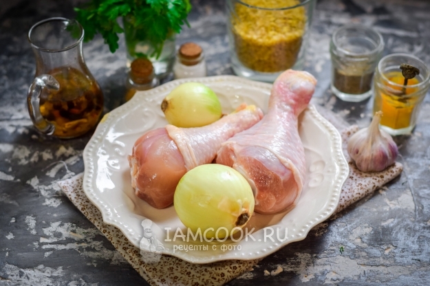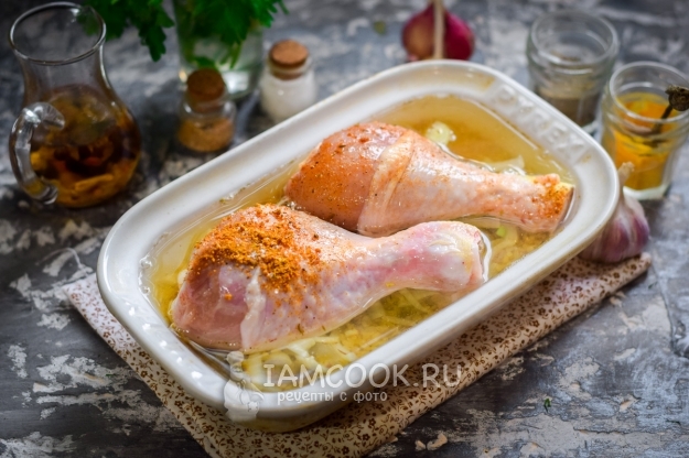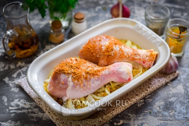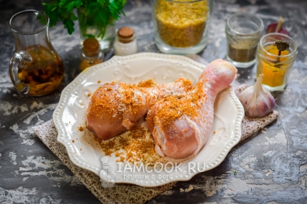 Куриные голени ополоснуть и просушить кухонными бумажными полотенцами. После посыпать голени специями для курицы.