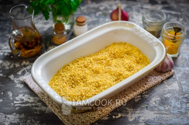 Подготовить форму для духовки, пересыпать в форму булгур.