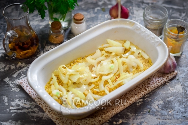 Отдельно прогреть сковороду, смазать маслом. Лук очистить и нарезать полукольцами, переложить в сковороду, поджарить пару минут. Лук уложить в форму с булгуром.