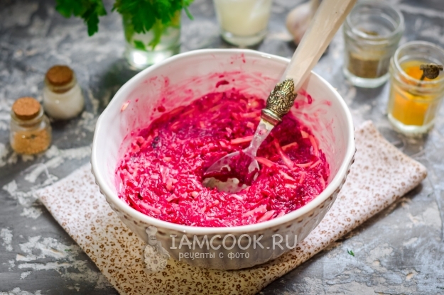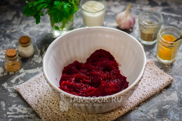 Свеклу заранее отварить или запечь до готовности. Натереть свеклу на мелкой терке. Если она слишком сочная, отжать сок и переложить свеклу в тарелку.