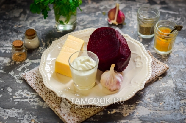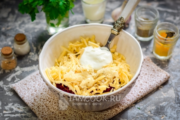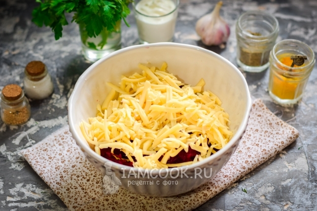 Твердый сыр натереть на средней терке, после добавить сырную стружку в миску со свеклой.