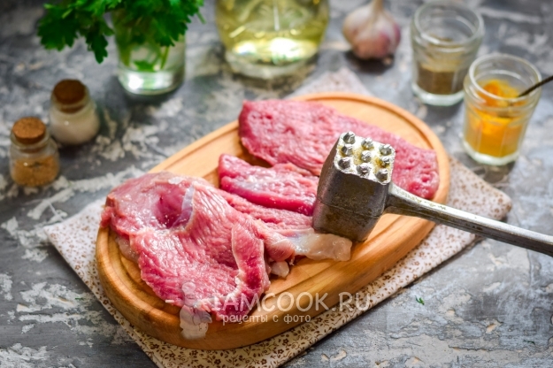 Каждый кусочек индейки отбить при помощи кухонного молотка, не забыв при этом прикрыть мясо пищевой пленкой.