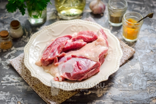 Бедро индейки ополоснуть и просушить кухонными бумажными полотенцами. Кожу с бедра удалить, мясо нарезать порционными кусочками.