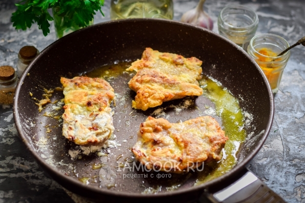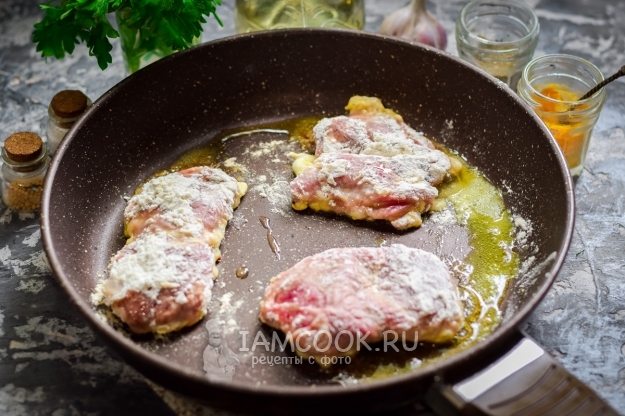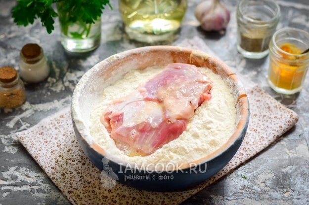 После обмакнуть индейку в пшеничной муке, по желанию можно использовать панировочные сухари. Теперь посыпать отбивные солью, перцем.