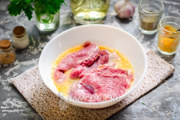В отдельной миске взбить куриное яйцо. Переложить в яйцо кусочки бедра индейки.