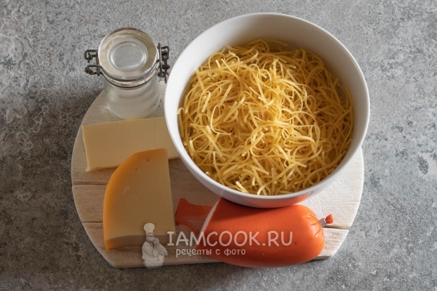 Пока варится лапша, трём колбасу на мелкой тёрке.