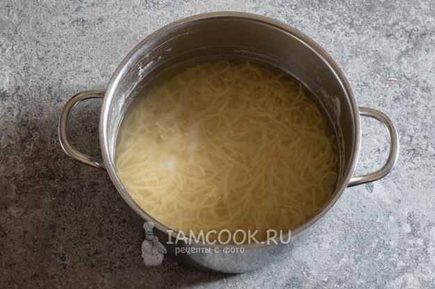 Отвариваем самую тонкую лапшу, какая есть в вашем распоряжении, согласно руководству на упаковке. У меня - 5 минут с момента закипания в слегка подсоленной воде.