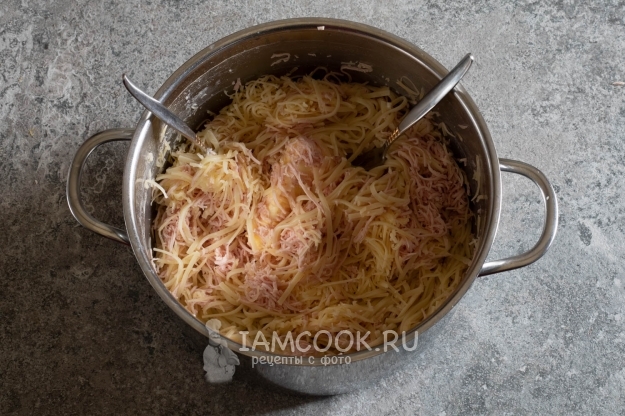 Хорошо перемешиваем лапшу в кастрюле (она ещё горячая) с маслом, тёртой колбасой и сыром до получения полностью однородной массы.