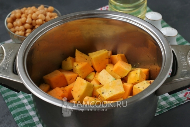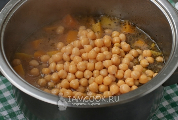 Когда тыква станет мягкой, добавить в кастрюлю отварной нут и готовить вместе 5 минут.