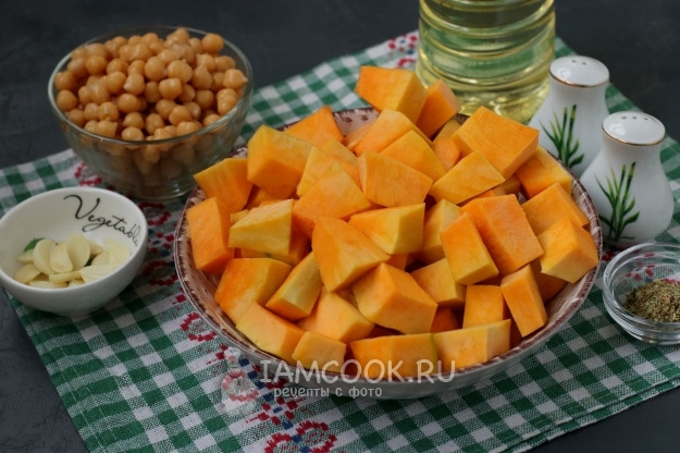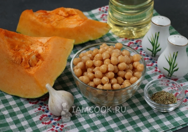 Для приготовления тыквенного супа-пюре с нутом подготовить из списка необходимые ингредиенты.