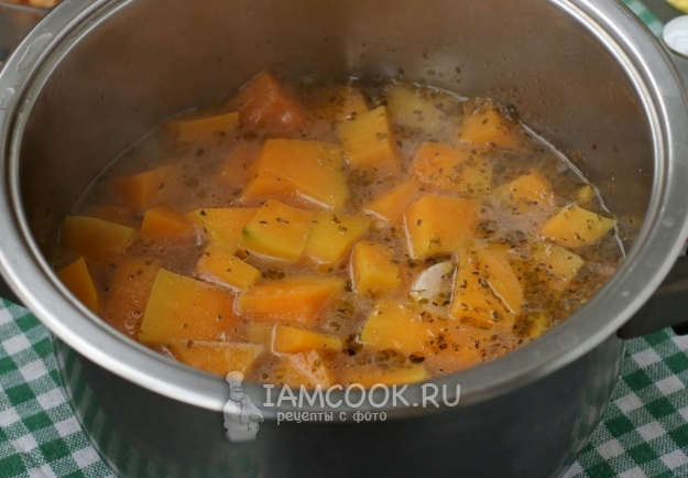 Залить тыкву водой, так, чтоб она покрывала тыкву не полностью. Добавить в воду соль и перец и варить до готовности.