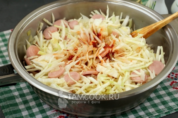 Добавить в сковороду капусту. Томатную пасту разбавить водой, добавить в капусту и перемешать. Посолить и поперчить, накрыть сковороду крышкой и готовить 10 минут на среднем огне.