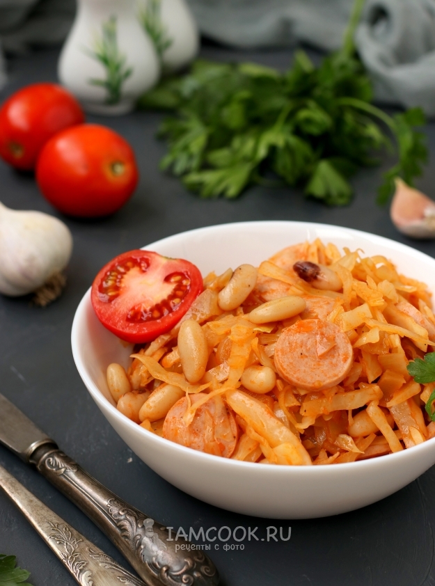 Разложить готовую тушеную капусту с сосисками и фасолью в тарелки и подать к столу.