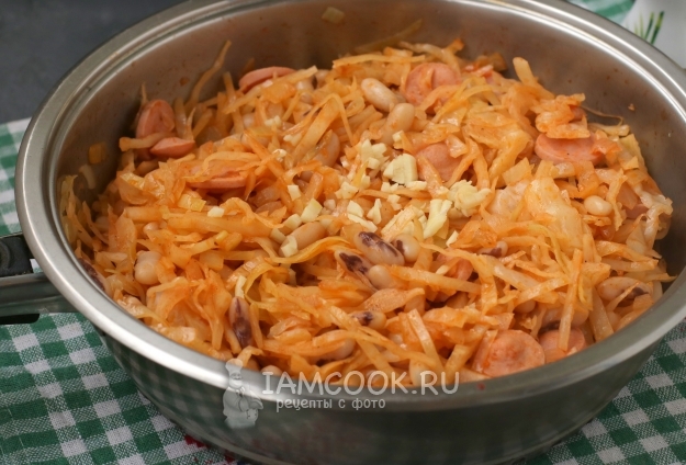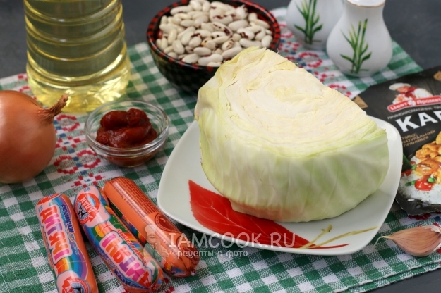 Для приготовления тушёной капусты с сосисками и фасолью подготовить из списка необходимые ингредиенты.