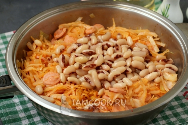 Предлагаю вам вариант тушёной капусты с сосисками и фасолью. Такое блюдо получается достаточно сытным за счёт фасоли, которая является источником белка, а сосиски добавляют мясной вкус, и в целом всё получается очень гармонично.