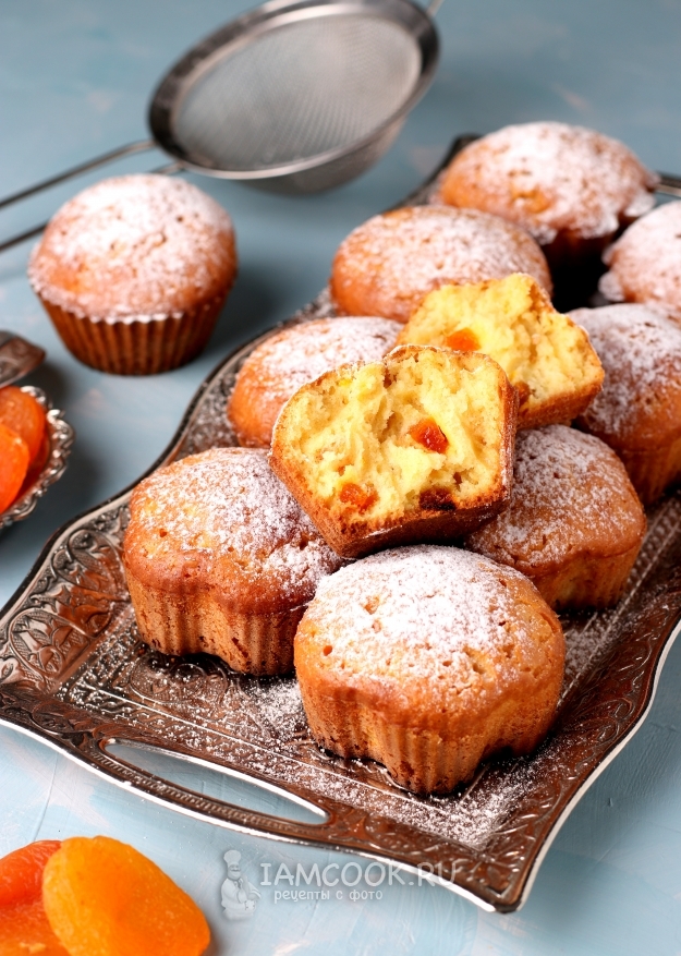 Духовку разогреть до 180 градусов и выпекать сметанные кексы с курагой 20-25 минут.