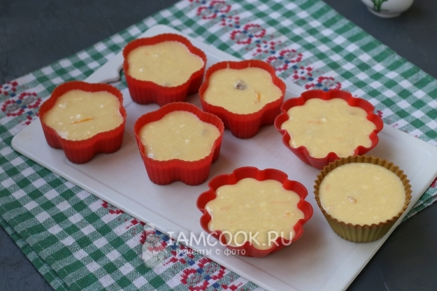 Разложить тесто в формочки. Силиконовые не смазывать, в железные можно вставить бумажные манжетки или смазать их маслом и присыпать мукой.
