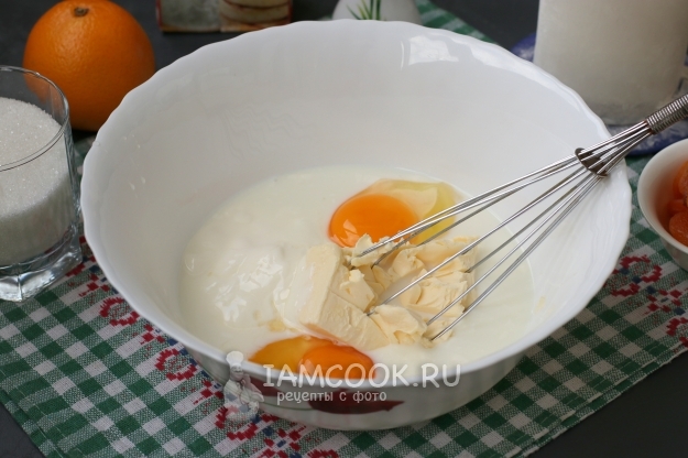 В глубокой миске смешать молоко, сметану, яйца и мягкое сливочное масло.