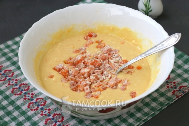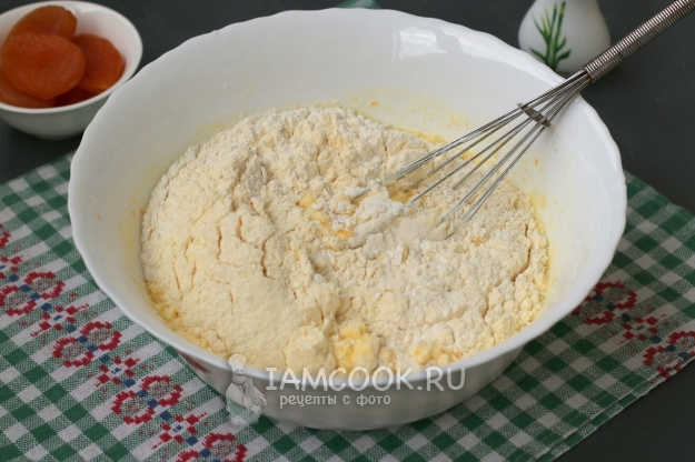 Тесто получается как сметана средней густоты. Нарезать курагу кусочками, обсыпать мукой и добавить в тесто, хорошо перемешать.